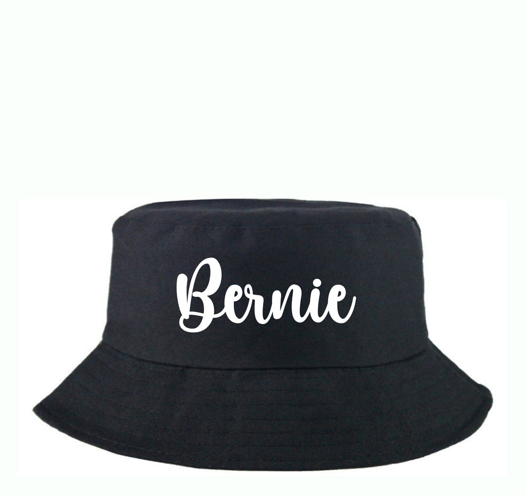 Bernie Bucket Cap or we can customize one for you with whatever print you want on the cap!   Cotton   Custom Hot Stamping Logo Bucket Cap  - Flat Top  UNISEX   YOU MUST SEND US A NOTE ON WHAT PRINT YOU WANT ON THE CAP.   We can put on Bernie's name in either white or black text.  You can also order these caps plain - with no text at all.