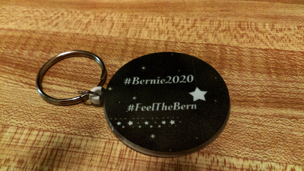 #Bernie2020 Key Chain with #Bernie2020 and #FeelTheBern printed (white text) on a beautiful starry black background. MADE IN THE USA.